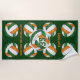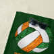 This volleyball team spirit beach towel features a pattern of green, orange and white stylized volleyballs arranged in a mirrored pattern with customizable text between the volleyballs, currently team name & mascot name - the athlete's name and jersey number can be personalized, as well as the darker green background colour - by katz_d_zynes
