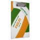 This volleyball team colours clipboard for a girl's or boy's volleyball coach features the image of an abstractly oversized green, orange and white volleyball upon which you can customize coach's name plus the school and mascot name and school year/season - by katz_d_zynes