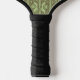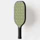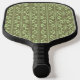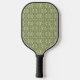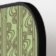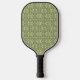 This pickleball paddle has an art deco design of three ovals broken across two very thin rectangles in camo green on a field of light green. Want the same design with different colours? Message me.