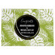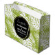 Wedding gift bag (large sized) with a repeating pattern of large palm leaves on an olive green background. Trendy modern and tropical. A black circle with a gold inner border layered over top with your personalized details inside.