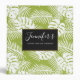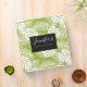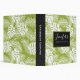 A personalized binder with a repeating pattern of large palm leaves on an olive green background. A black rectangle with a gold border layered over top with your personalized details inside.