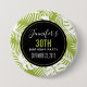 A birthday button with a repeating pattern of large palm leaves on an olive green background. Trendy modern and tropical. A black circle with a gold inner border layered over top with your personalized details inside.