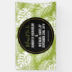 Wedding banner with a repeating pattern of large palm leaves on an olive green background. Trendy modern and tropical. A black circle with a gold inner border layered over top with your personalized details inside.