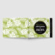 A wedding guestbook with a repeating pattern of large palm leaves on an olive green background. Trendy modern and tropical. A black circle with a gold inner border layered over top with your personalized details inside.