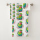 Towel set with a cute parrot illustration. A little green parrot with blue and yellow colours blending together. Neck has a vibrant shade of reddish pink.