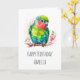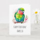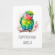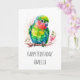 Birthday card with a cute parrot illustration. A little green parrot with blue and yellow colours blending together. Neck has a vibrant shade of reddish pink.