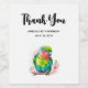 Thank you birthday or other event bottle labels with a cute parrot illustration. A little green parrot with blue and yellow colours blending together. Neck has a vibrant shade of reddish pink.