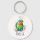 Personalized keychain with a cute parrot illustration. A little green parrot with blue and yellow colours blending together. Neck has a vibrant shade of reddish pink.