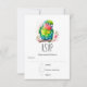 An RSVP card with a cute parrot illustration. A little green parrot with blue and yellow colours blending together. Neck has a vibrant shade of reddish pink.