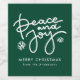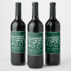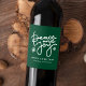 Modern holiday wine labels featuring "Peace and Joy" displayed in a hand-lettered white script with snowflakes and a green background. Personalize the green Christmas gift tags with a custom greeting and your family name.