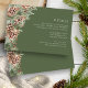 Green Pine Wedding Details Enclosure Card. Guide your guests with ease using our horizontal wedding details card, featuring a side bouquet on a green background. Part of the "Elegant Winter Pinecone Greenery Wedding Suite," this card combines essential information with hand-painted elegance, ensuring a cohesive and captivating aesthetic.