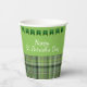 Green Plaid Flags Happy St Patrick`s Day Paper Cups. Happy St. Patricks`s Day text with green shamrocks on bunting flags and green plaid. You can change the text.