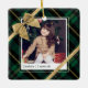 Elegant and festive special memory family photo multi-coloured green plaid faux fabric pattern ornament. Designed to resemble a Christmas present. We've decorated the ornament with a beautiful gold bow and ribbon. Single photo layout on each side of the ornament to display your special family photo or your kid's photo with custom caption on each side. Plaid design created by Moodthology Papery.
