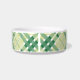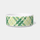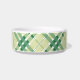 Pet bowl, featuring a classic plaid pattern design, on shades of green.