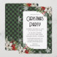 Elegant green buffalo plaid Christmas party invitation featuring white poinsettia, holly, red berries and snowflakes.