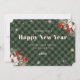 Green buffalo plaid New Year card featuring snowflakes and a watercolor painting of poinsettia, holly and red berries. Easily personalize online.