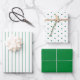 This set of wrapping paper sheets features a solid green coloured sheet with coordinating sheets of green pinstripes on white, and green polka dots on white.