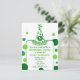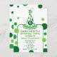 A birthday party invitation featuring a green colour scheme. Illustration of a party hat with green polka dots and fringe at top. Personalize with number on hat. Polka dots surround customizable green text. Polka dots on reverse.