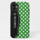 Stylish iPhone 5 case designed with a white polka dots over green pattern, a black frame over the left side, and personalized with your name or custom text in white across the black frame. This design is perfect for vertical and horizontal use of the iPhone 5.