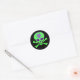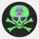 Black sticker with a purple and green biohazard symbol skull and crossbones design.