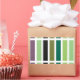 Geometric linear, rectangle, striped pattern of black, purple and green hues.