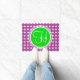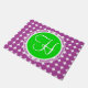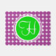 Purple dots in close quarters create a secondary pattern of white stars. A large green circle is surrounded by white lines, while a single white initial graces the centre.