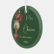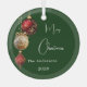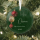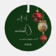 A green coloured gradient background. Decorated with red and gold baubles. Personalize and add your name, year. Text: Merry Christmas