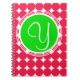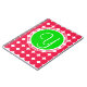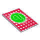 Red dots in close quarters create a secondary pattern of white stars. A large green circle is surrounded by white lines, while a single white initial graces the centre.
