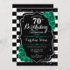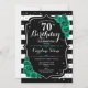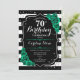 70th Birthday Party Invitation. Elegant floral emerald green design with faux glitter silver and roses. Features black and white stripes and script font. Perfect for a stylish women's bday celebration. Can be customized for any age! Printed Zazzle invitations or instant download digital printable template.