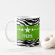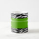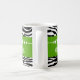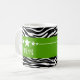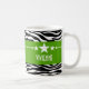 Trendy and modern Sassy Star Zebra Mug featuring a chic black and white zebra print background and a bold chartreuse green border adorned with a fun star motif. This girly design may be customized with the personalized text of your choosing. Click "Customize It" to find more personalization options.