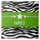 Trendy and modern Sassy Star Zebra Tile featuring a chic black and white zebra print background and a bold chartreuse green border adorned with a fun star motif. This girly design may be customized with the personalized text of your choosing. Click "Customize It" to find more personalization options.