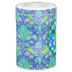 A green sea turtle with patterned shell, against a blue water/wave pattern, with several colourful fish. Circular design with a green border. Sea turtle art.