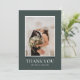Share your gratitude in a timeless way with this dark green wedding thank you card featuring a bold typography design, modern photo frame, and subtle shadow effect that adds depth to your favourite wedding photo. The shadow effect can be easily removed if desired, giving you flexibility to keep the look minimal or slightly dimensional. Perfect for weddings, anniversaries, or any occasion where you want to send an elegant thank you.