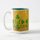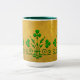 Vintage art of a three-leaved shamrock in Irish green with curly gothic elements along the bottom on a grungy faux parchment background.