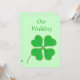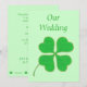 Painting of a green shamrock, four leaf clover, trimmed in gold dots, printed on wedding invitations. Easily customize the text on the template forms.