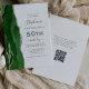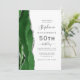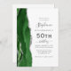 The left-hand edge of this elegant modern 50th birthday party invitation features a green watercolor agate border trimmed with silver faux glitter. The customizable text combines charcoal grey handwriting, copperplate and italic fonts on a white background. Add RSVP instructions on the back of the card, along with a QR code guests can scan to respond online.