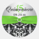 This 1.5" round lime green, silver grey, and black damask Quinceanera 15 sticker or envelope seal has a PRINTED ribbon and a PRINTED diamond jewels buckle on it that matches the quinceanera party invitation shown below. Customize with your own text. Other shapes and sizes are also available. ***USE caution if you choose a different shape, as some text may get cut-off during printing. Everything will print as it appears on your monitor, and there is a large safety zone around the edge of the stickers, so it would probably be best if you contact me at the email address below if you prefer an alternate shape or need to add additional text. If you need any assistance, please email niteowlstudio@gmail.com for help.