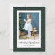 Custom green snowflake photo Christmas cards with calligraphy title and featuring a green snowy photo frame on the front and snowflakes at the back. Easily personalize these snowy photo Christmas cards with your image and family name.