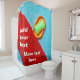 An image of a red body scrubber, a yellow soap dish with a green soap block inside on a blue Turkish towel. A customizable shower curtain for anyone. You can change or delete two texts independently. You can transfer this design to another product of your choice, just choose one from the line on this page. Have fun and stay safe.