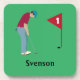 Square green personalised golfer, wearing a cap, deep red shirt and blue pants, putting a golf ball into a hole plastic coaster.