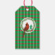 These gift tags has a green background with red and white lines that form a pattern of squares. In the centre there's a white circle with an evergreen wreath and Cardinal. Twine, shown here in red, comes in four colours.