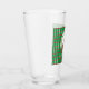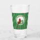 This glass has a green background with red and white lines that form a pattern of squares. In the centre there's a white circle with an evergreen wreath and Cardinal.