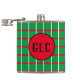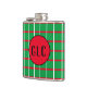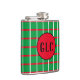 This design has a green background with red and white lines that form a pattern of squares. In the centre of the flask there's red circle, with an area for your initials.