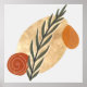 A boho inspired design of simples shapes in rustic colours of brown, beige, and orange with a floral plant stalk as the focus.