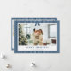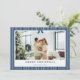 Wish friends family Happy Holidays with a personalized horizontal navy blue Christmas DIY photo Christmas card showcasing your family on the front over a blue striped pattern and a watercolor navy blue bow, and a back side with 3 family pictures and an editable note.