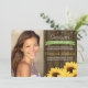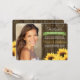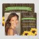 Add your favourite senior class picture to these sunflower graduation photo announcements and invitations with a country vintage charm. Painterly golden yellow sunflowers border this new grad invite with a brown wooden fence background with nail head trim that reminds one of old barns, a farmhouse or barrel. Add the year of your graduating class onto the grass green printed ribbon banner look design. Graduation ceremony and celebratory party details can be added to the back of this invitation. Design © Chrissy H. Studios, LLC. All rights reserved.