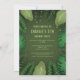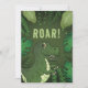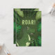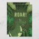 Destei's original cute cartoon illustration of a green Tyrannosaurus Rex / T-rex dinosaur. There is also a personalizable text area above the dinosaur that now reads: "Roar!". The design is framed by tropical plants including ferns and monstera leaves. On the other side there are personalizable text areas.