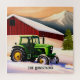 A farmer's favourite green tractor is parked in front of a red barn in the snow.