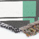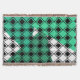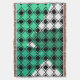 This thro blanket has a mid-century modern design of solid black diamonds inside black diamond outlines with triangles in shades of seafoam green under them, all on a field of white.