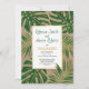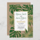 Green and gold tropical monstera and palm leaves kraft paper engagement party invitation. It showcases a pattern of tropical leaves with gold outline on kraft paper and your text in a white frame. The back includes a gold polka dot pattern.